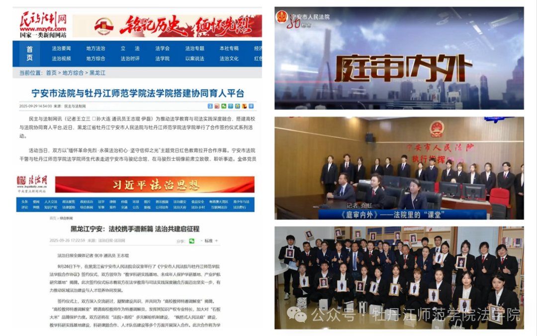 牡丹江师范学院法学院作为黑龙江省东南部唯一设有法学院的高校,为进一步贯彻落实《关于加强新时代法学教育和法学理论研究的意见》,9月26日法学院与宁安市人民法院通过法院视频号进行了4个小时的“法校携手谱新篇,法治共建启征程”全程直播活动。双方以“‘金’‘枫’景调解工作e站”与“产业护航研究基地”为基础,按照党建引领法学类专业创新人才培养开展了系列活动,展现了一场生动的法治文化、法学教育、法律实践育人和传承红色法治基因的法学院思政课。近几日,国家级媒体“法治网”“民主与法制网”,黑龙江省电视台新闻夜航、庭审内外等媒体报道了学校法学院“法路同行,师者领航”网络直播活动。