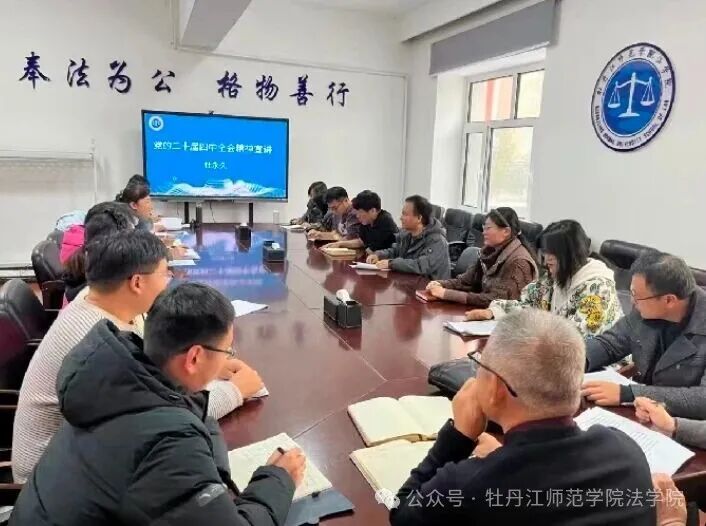 为深入学习贯彻党的二十届四中全会精神,推动全会精神在法学院落地生根、取得实效,法学院于11月26日在美术楼207会议室组织召开了学习贯彻党的二十届四中全会精神宣讲会。会议由学院党委书记杜永久主讲,学院全体教职工参加。